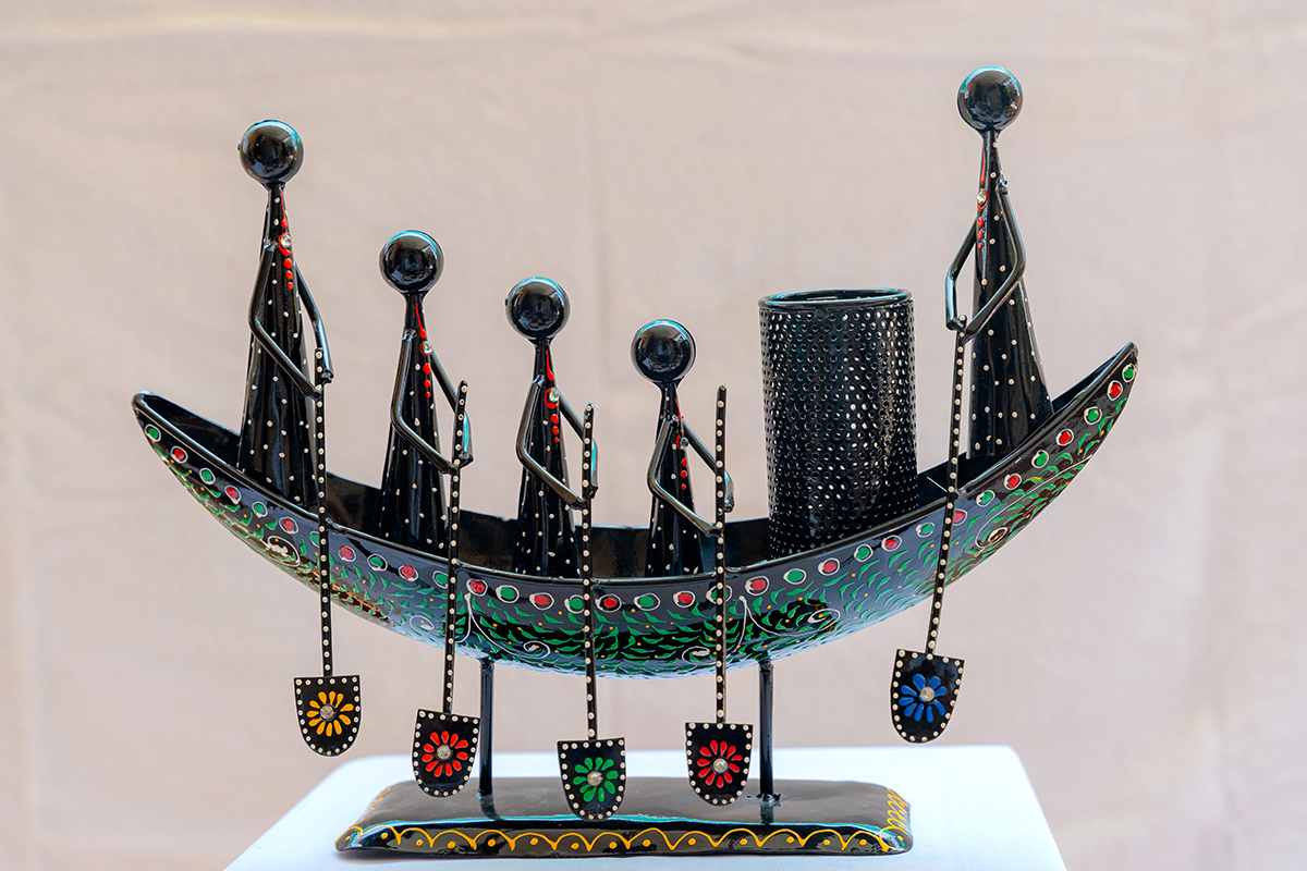 Celebrate the charm of traditional craftsmanship with this stunning handcrafted tribal boat showpiece. Made from durable wrought iron, it features five elegant tribal figurines rowing together, painted in a striking black finish with colorful accents. The boat is beautifully decorated with hand-painted floral and geometric patterns, showcasing a blend of tribal and folk artistry.
