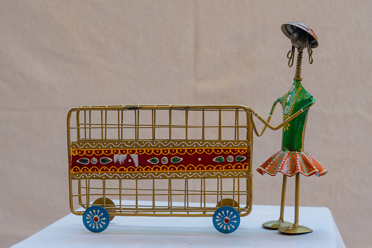 Bring a touch of traditional Indian craftsmanship to your decor with this "handmade tribal figurine pushing a decorative cart". Crafted from high-quality wrought iron and hand-painted in vibrant hues of green, orange, and red, this piece reflects the rich heritage of rural and tribal artistry.
