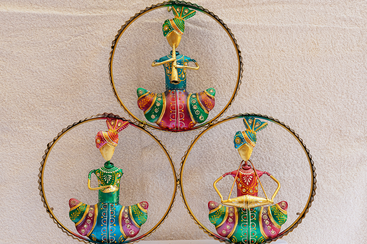 Bring a touch of vibrant tradition to your home with this stunning set of 3 handcrafted Rajasthani musician wall hangings. Each piece features a musician playing a different instrument, beautifully enclosed in a golden circular frame. The intricate detailing, bright colors, and folk art patterns reflect the rich cultural heritage of Rajasthan.