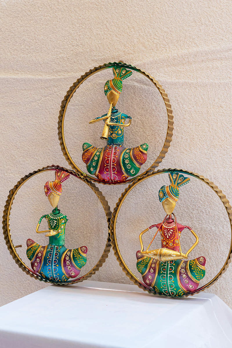 Bring a touch of vibrant tradition to your home with this stunning set of 3 handcrafted Rajasthani musician wall hangings. Each piece features a musician playing a different instrument, beautifully enclosed in a golden circular frame. The intricate detailing, bright colors, and folk art patterns reflect the rich cultural heritage of Rajasthan.
